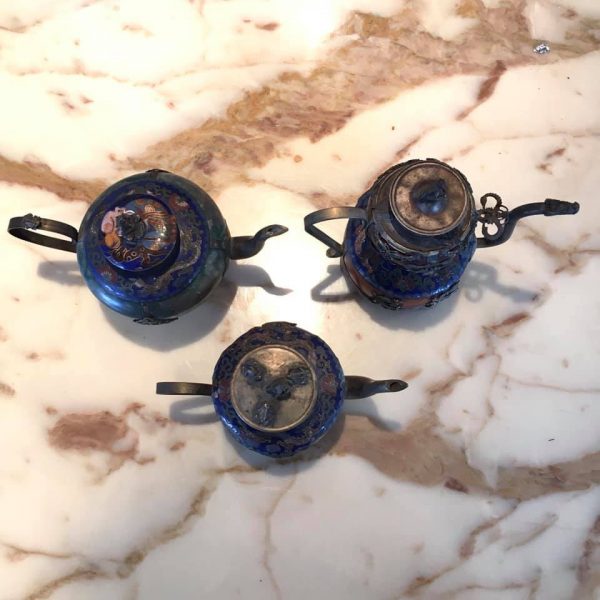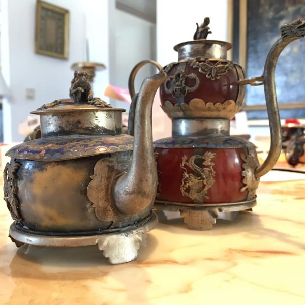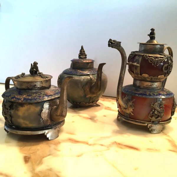 Drei antike kleine metallgefasste sehr schön verzierte Kännchen aus (wir vermuten Jade, Achat & Tigerauge) China.