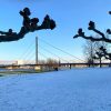 Wie überall verkündet wurde die Nacht kälter, als ich am Morgen wach wurde, na kein Blick, meine großen Fensterscheiben, durch die ich meist morgens den Sonnenaufgang oder die Regenschauer sehe, waren blind. Ja, der Schnee und der Eisregen hatten sie zugedeckt. Und als ich durch die Wohnung ging, alle meine Lichter anmachte, wie schön lag die Straße von oben gesehen vor mir. Kein Verkehr, alles weiß , totale friedvolle Stimmung. Ich fühlte mich hier oben heute Morgen so sicher wie in einer Höhle, rundum alles so angenehm. Und als ich dann noch von unten die Nachricht bekam meine Zeitung läge vor der Türe bei mir – hola da konnte der Sonntagmorgen beginnen.